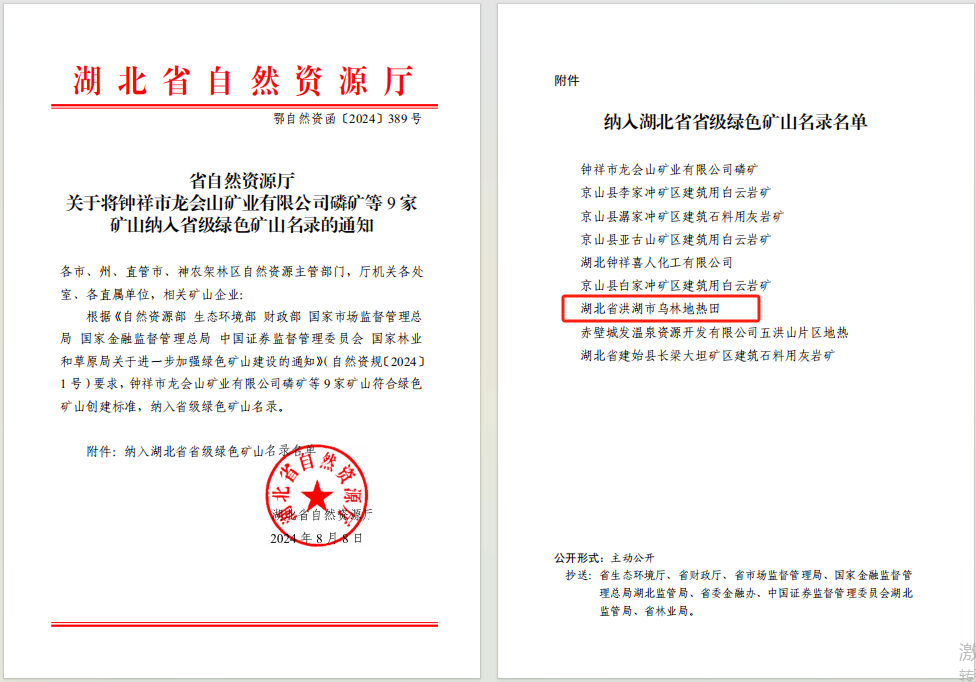 悅兮半島烏林地?zé)崽锛{入省級(jí)綠色礦山名錄
