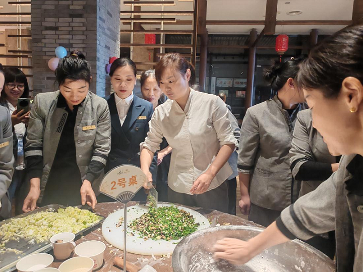 下午13:30,活動(dòng)準(zhǔn)時(shí)開場(chǎng)。員工們分為四個(gè)小組,餐飲組、客房組、營(yíng)銷景區(qū)組和綜合組在各自組長(zhǎng)的帶領(lǐng)下,開啟包餃子大戰(zhàn)。大家洗凈雙手,圍坐在桌前,有人負(fù)責(zé)揉面,面團(tuán)在他們的手中不斷翻滾,變得光滑有彈性;有人負(fù)責(zé)搟皮,搟面杖在面板上輕快地滾動(dòng),一張張薄厚均勻的餃子皮快速成型。包餡的員工們更是各顯身手,把豬肉、白菜、韭菜、香菇等餡料巧妙地包裹在餃子皮中,有的捏出精致的花邊,有的包成小巧的元寶形狀。每組 10 人齊心協(xié)力,配合默契,歡聲笑語回蕩在大堂吧。